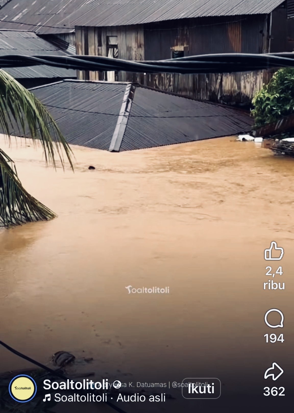 Sejumlah akun sosial media dipantau redaksi hingga Senin (27/10/2025) siang ini terus meresonansikan hujan dengan intensitas lebat. Beberapa rumah nampak keliatan atap. Beberapa video amatir merekam kejadian yang memilukan tersebut.