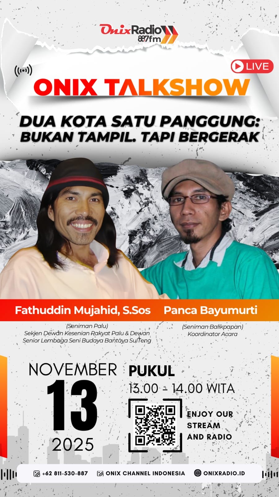 Menurutnya, sensasi seni satu panggung dua kota akan digelar besok, Sabtu 15 Nopember 2025 di Balikpapan Plaza. Sebelumnya, 13 Nopember telah diisi Onix Talkshow rangkaian dari puncak besok malam.