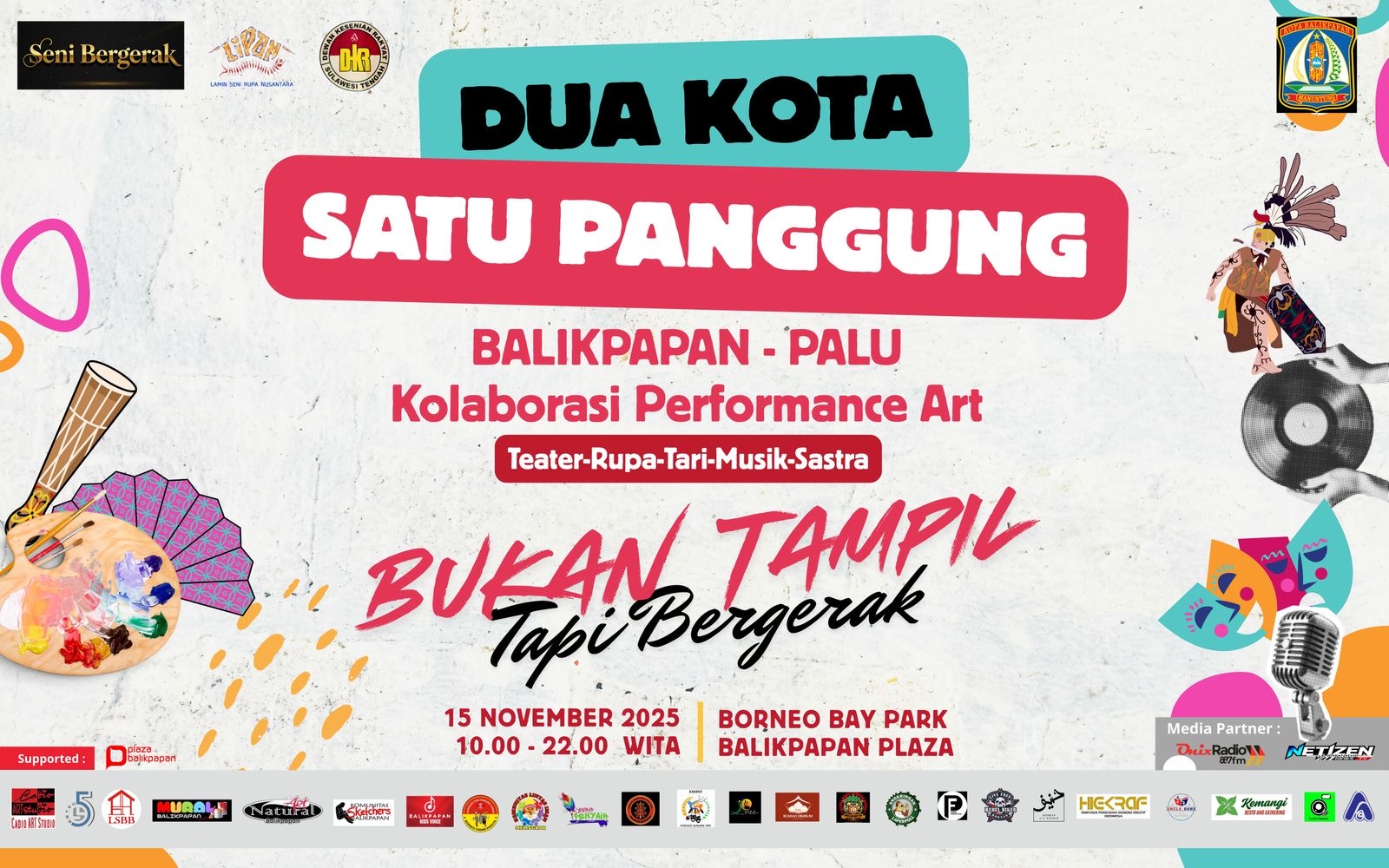 BALIKPAPAN – Temanya bukan hanya tampil satu panggung. Namun, sebuah kesatuan energi bergerak bersama, dua kota. Seni tidak lahir dari panggung megah atau tepuk tangan. Ia tumbuh dari tanah yang retak, dari tangan yang belepotan cat, dari suara yang tak sempat didengar.