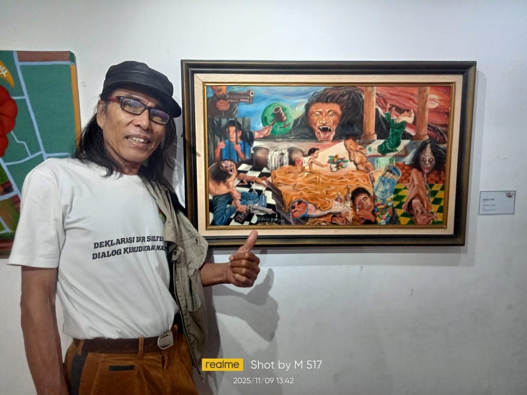 BALIKPAPAN – Pelukis Sulawesi Tengah Fathuddin Muhajid, atau dikenal luas Udin FM memamerkan lukisannya di Pameran Seni Lukis Nasional 2025 di Art Center Kota Balikpapan Kalimantan Timur.