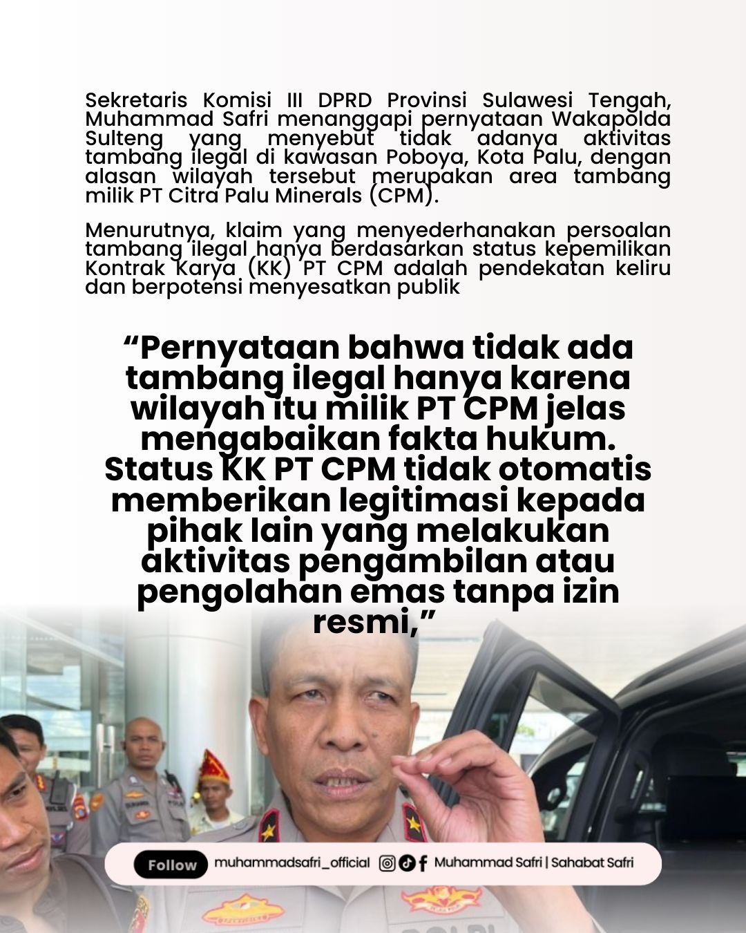 Safri menekankan bahwa status hukum PT CPM sebagai pemegang Kontrak Karya (KK) justru seharusnya memudahkan pengawasan, bukan malah dijadikan tameng untuk membiarkan pihak lain mengeruk hasil bumi secara ilegal.