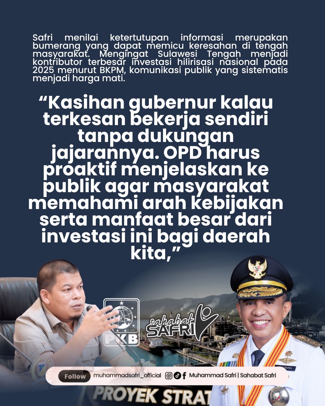 Safri menilai ketertutupan informasi merupakan bumerang yang dapat memicu keresahan di tengah masyarakat. Mengingat Sulawesi Tengah menjadi kontributor terbesar investasi hilirisasi nasional pada 2025 menurut BKPM, komunikasi publik yang sistematis menjadi harga mati.