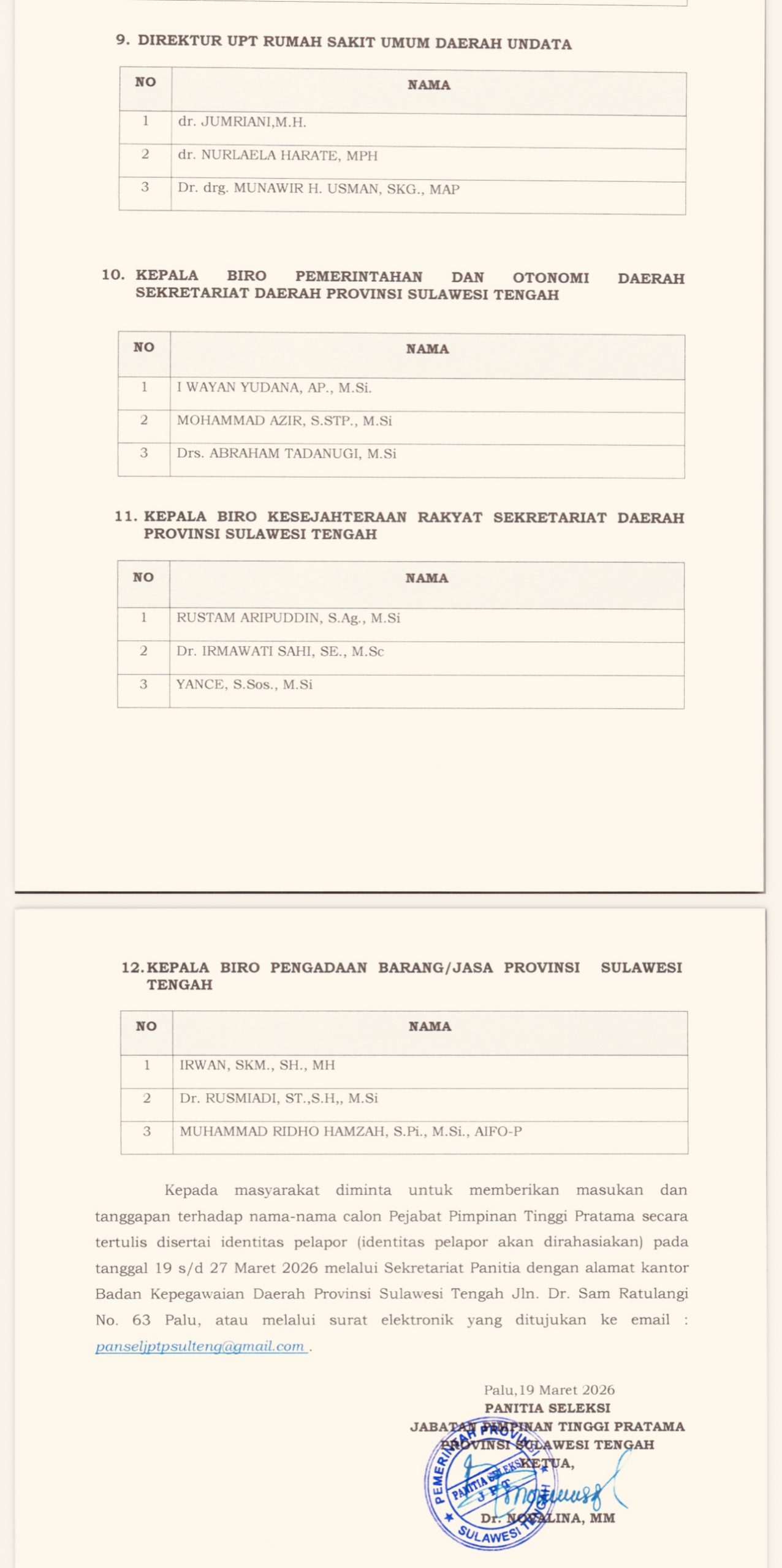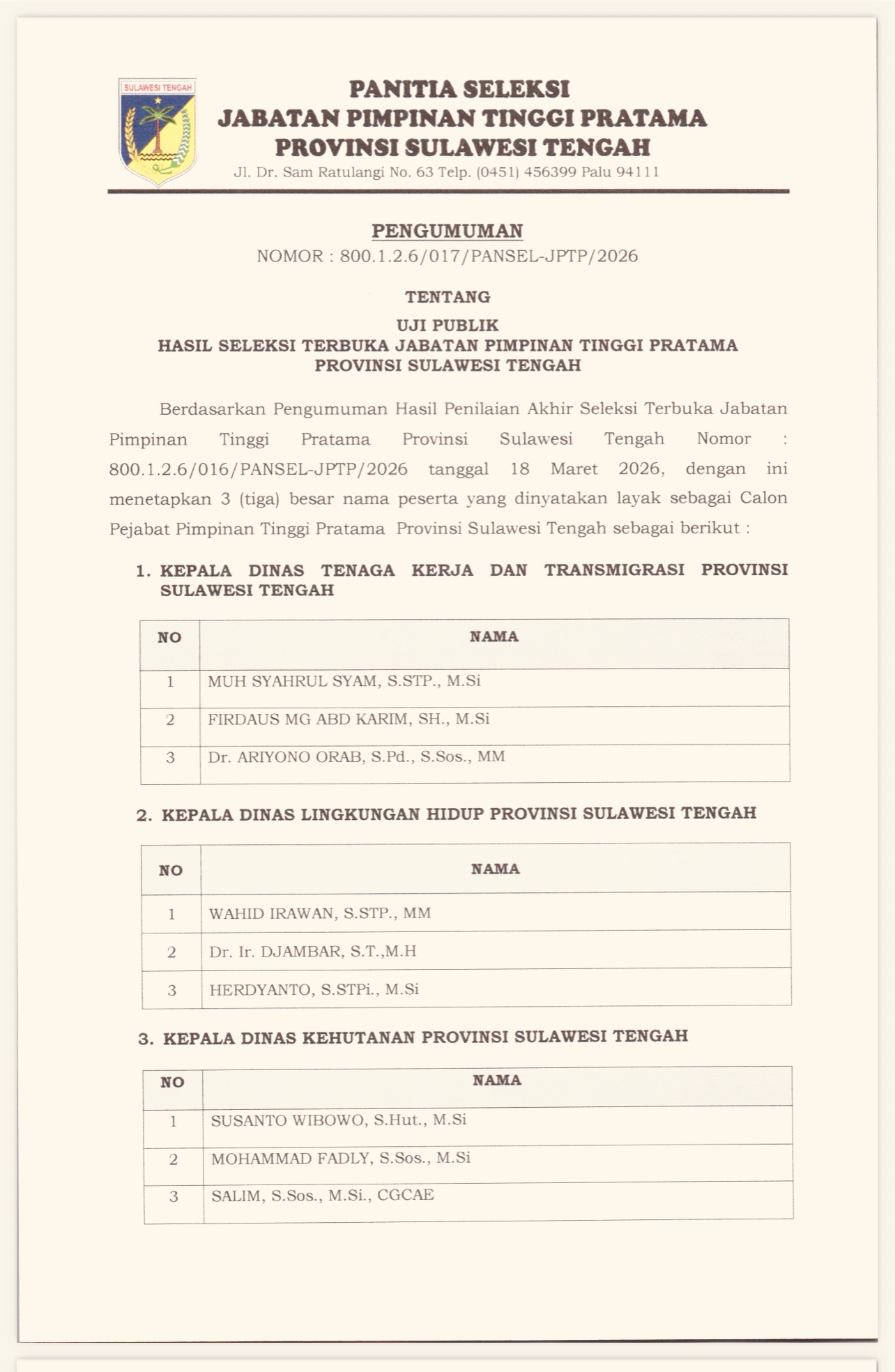 SULTENG – Hasil Uji Publik Seleksi Terbuka Jabatan Tinggi Pratama Provinsi Sulawesi Tengah ada tiga besar nama. Ketiga nama calon pejabat yang akan menempati jabatan tinggi pratama telah diumumkan 19 Maret 2026 yang ditandatangani Ketua Panitia Seleksi Dr Novalina.